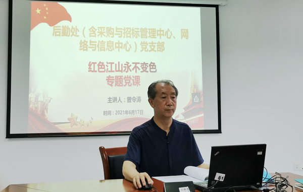 6月17日下午3点,后勤处(含采购与招标管理中心、网络与信息中心)党支部在行政楼409会议室开展专题学习活动,学校党委副书记、副校长曾令涛作“红色江山永不变色”党课专题宣讲学习。后勤处、采购招标管理中心、网络与信息中心全体党员干部、积极分子参加了本次学习活动。