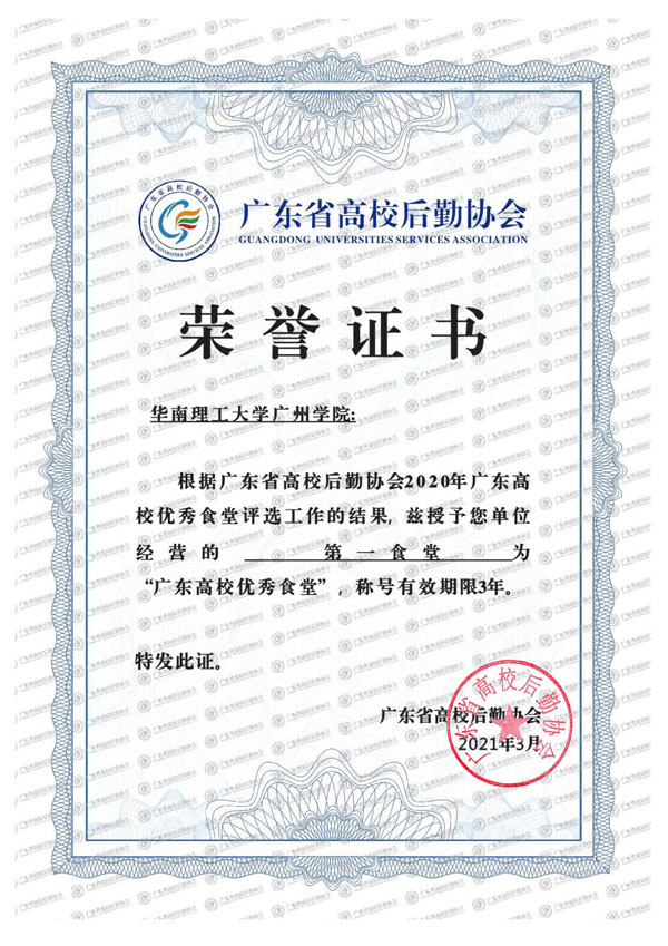 “广东高校优秀食堂”荣誉证书(林雯洁 摄)