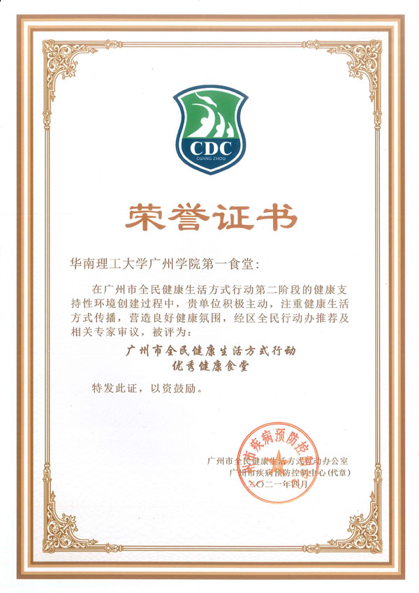 与此同时,在广州市全民健康生活方式行动方案落实过程中,花都区市场监督管理局经过全面的考察评估,推荐我校参与“健康食堂”的创建和申报工作。我校积极响应,对创建“健康食堂”工作进行了整体部署,2020年创建期间,学校第一食堂对厨房操作区和餐厅橱窗进行了重新规划设计,开设了“营养餐”专窗,多次组织食堂的管理人员和操作人员参加健康膳食“三减”知识的专项培训,并专门定制了控盐勺、控糖勺和控油壶,有效地控制油、盐、糖的使用,确保食堂菜品营养健康。此外,食堂同步通过橱窗显示屏及公告栏定期更换健康饮食小贴士及日常膳食搭配资讯,生动形象地向师生展示膳食营养的有关知识,营造了健康食堂的良好氛围,让师生充分了解了健康生活的理念、切实感受到饮食改变带来的健康信号,得到了师生们的一致好评,也得到了监管部门的充分肯定。2021年1月份,第一食堂顺利通过了广州市花都区2020年全民健康生活方式健康支持性环境创建的督导验收,于近日取得了“广州市优秀健康食堂”的荣誉证书。截止目前,我校是广州地区首家获得此项荣誉的高校。