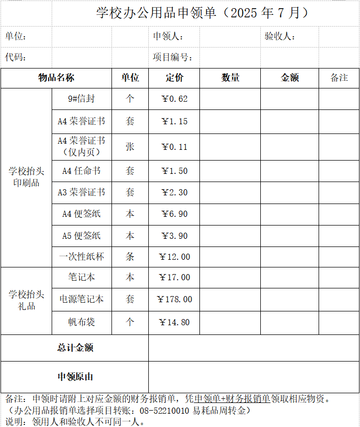 学校办公用品申领单(2025年7月).doc
