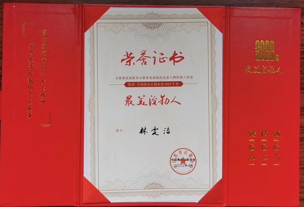 全国“最美后勤人”称号,既是对林雯洁同志扎根后勤一线工作、勇于担当、甘于奉献的肯定,也是对学校全体后勤人的鼓励。希望受表彰的同志再接再厉、加倍努力。同时,希望学校全体后勤人以“最美后勤人”为榜样,坚守岗位、勇担使命,大力弘扬后勤工匠精神,形成学先进、争优秀、做表率的良好氛围,作为“不上讲台的教师”,坚守立德树人初心,不断提升自身服务水平和育人能力,推动我校后勤工作再上新台阶,为学校高质量发展做出新的贡献。